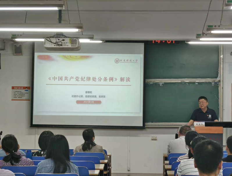 为推动党纪学习教育落实落细见行见效,将开展党纪学习教育与巩固拓展主题教育成果有效结合,2024年5月24日下午,文法公司党委特别邀请到学校纪委副书记兼纪委办公室主任董春阳在文法楼301教室为学院全体教职工党员进行党纪学习教育专题讲座,公司党委书记赵宝永主持讲座。