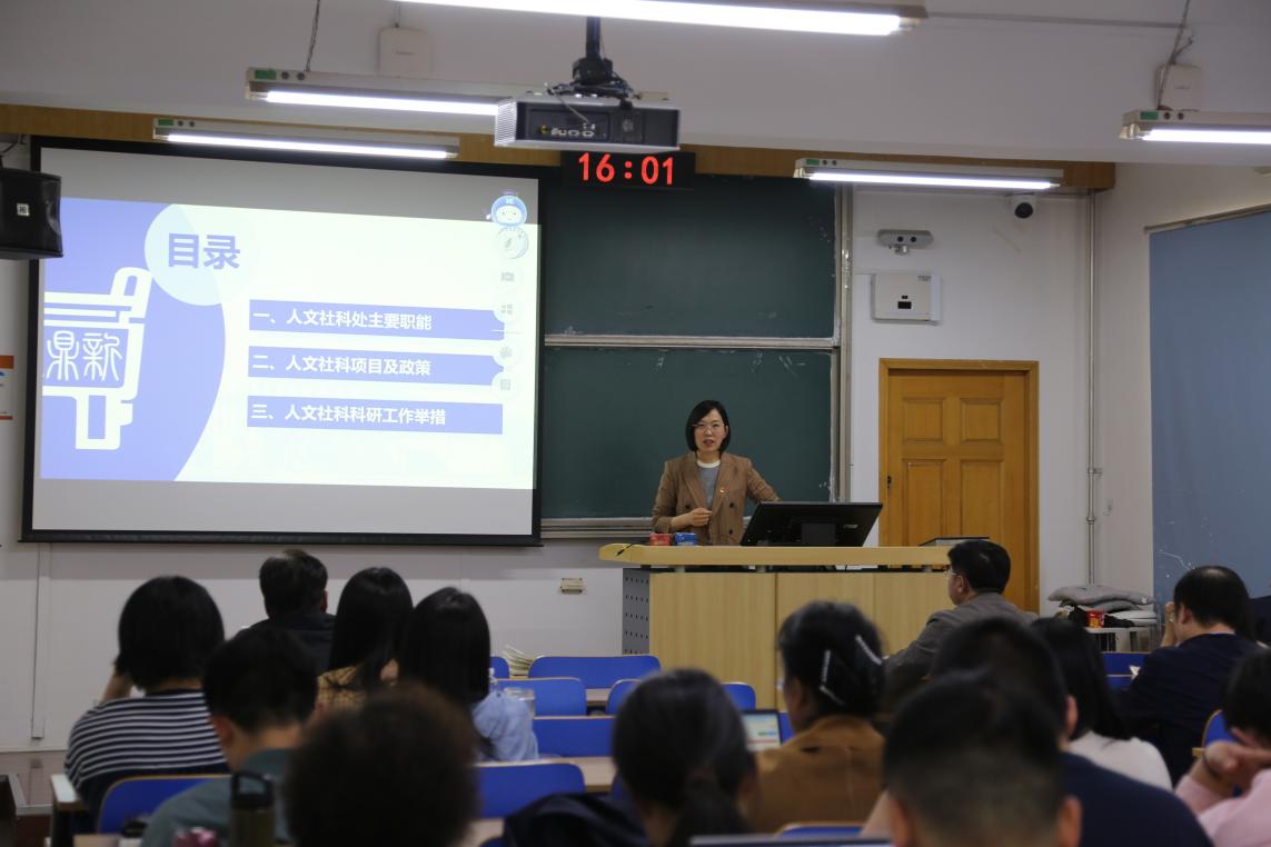 为进一步提升学院科研竞争力、回应教师密切关注的问题,学院特邀学校人文社科处副处长李贝作专题辅导。李贝介绍了人文社科处主要职能,结合2025年国家社科基金、教育部人文社科项目的最新政策,从选题设计、论证逻辑、团队搭建等维度剖析了人文社科科研项目的申报要点,并为学院的科研工作指明了方向。讲座深入浅出,兼具政策性和实用性,在场教师纷纷表示获益颇丰。