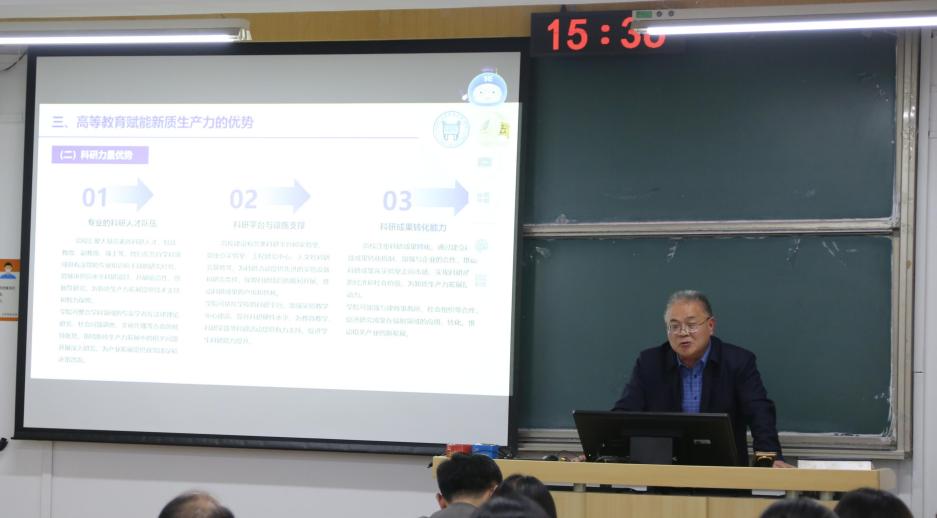 2025年4月24日下午,学院在文法楼301会议室举行教职工理论学习暨“领导干部上讲台”第二期活动。本次学习主要围绕“新质生产力驱动高质量发展”“本科公司产品数字化改革”“社科项目申报策略”三大主题展开。会议由公司党委副书记、行政副经理李虹主持,williamhill中国官方网站全体教职工参加学习。