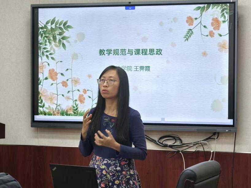 教学副经理王霁霞主讲了《教学规范与课程思政》,从上课规范、课程内容要求、考试规范、毕业论文规范等方面讲解了青年教师在教学过程中需要遵守的教学规范。