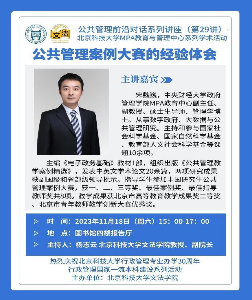 中国研究生公共管理案例大赛是“中国研究生创新实践系列大赛”主题赛事之一。为积极响应第八届中国研究生公共管理案例大赛,引导MPA研究生关注我国公共管理实际问题、运用公共管理理论分析实际问题的能力,williamhill中国官方网站MPA中心williamhill中国官方网站于2023年11月18日下午,举办《公共管理案例大赛的经验体会》专题讲座。