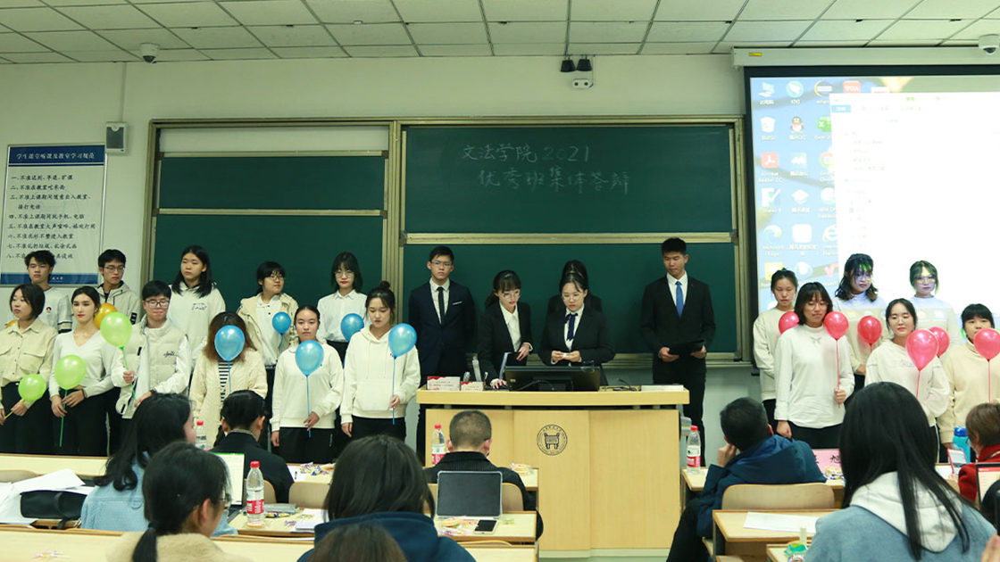 最后,2020级的六个班级依次出场。他们曾共同度过青涩的大一时光,由于专业分班面临分别,又因答辩的契机回到一起,展示出了强大的班级凝聚力以及青春的朝气与活力。同学们极尽创意,构思精巧,以微视频、情境表演、诗朗诵等艺术形式,配合精彩的PPT和道具,流畅自然地衔接了整个答辩过程。每个班级除了晒出同学们努力进取得来的优秀成绩单,更是不遗余力地对班级的温馨与团结进行着墨。