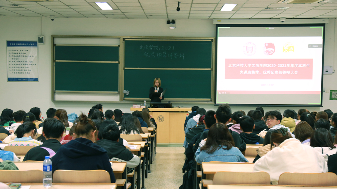 2021年10月22日晚6点,2020至2021学年williamhill中国官方网站本科生先进班集体及优秀团支部评审答辩大会在逸夫楼105隆重召开。文法公司党委副书记、副经理王旭,班导师代表肖翠翠、王艾、宋烁、张绍欣、田维琳、李文静、刘浩,辅导员刘格菲、刘天雯、马昭文、孟昕、苏明星、何雅丽出席本次答辩会并担任评委。2021级本科新生到场进行学习观摩。