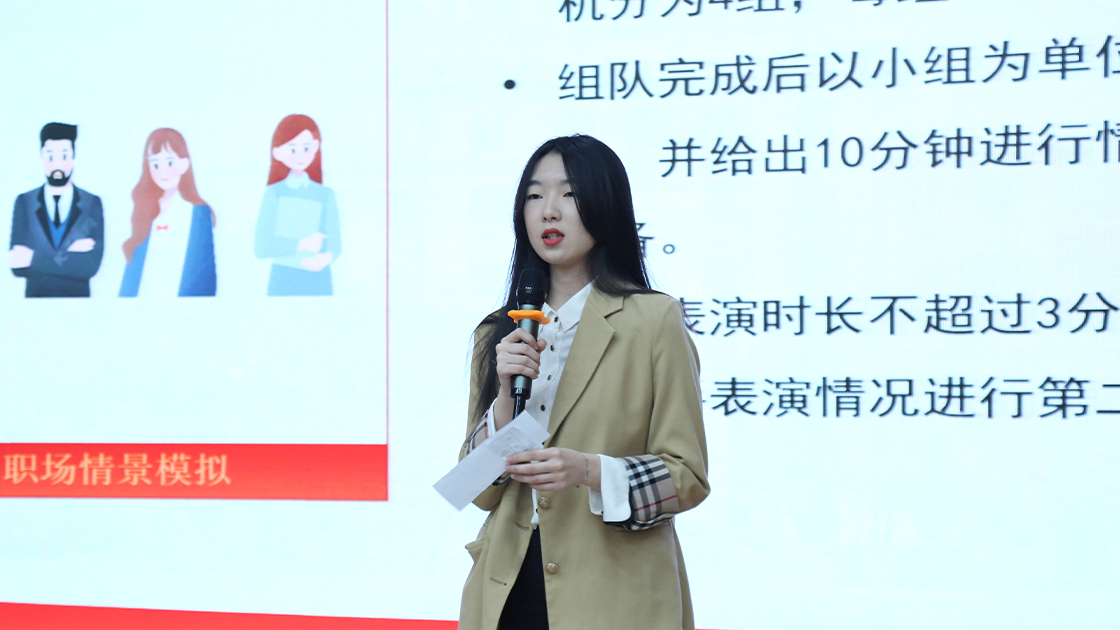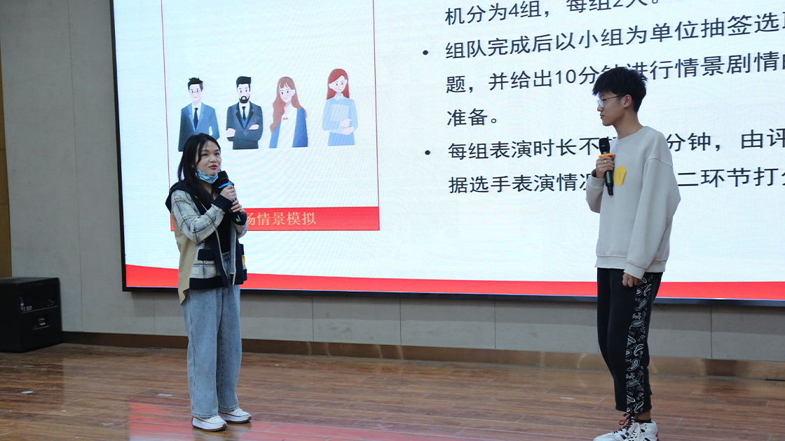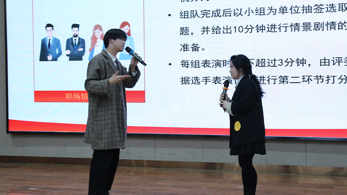 在即兴情景模拟环节,选手们两人一组,通过模拟职场情境即兴表演向观众与评委展示自己对职场的理解,体现了老员工在不同岗位上肩负的责任感与使命感。他们全情投入的表演的将现场氛围推到高潮,赢得评委老师的一致好评和在场同学的阵阵掌声。
