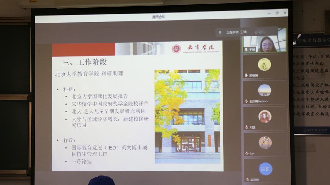 六位优秀的社会工作专业毕业员工通过线上连线分别结合自身留学经历和感悟,从留学申请书撰写、奖学金申请以及学业与日常生活等方面对留学相关事宜进行详细讲解。在讲解的过程中,学长学姐们均提到留学可以锻炼自己的独立能力,能够开阔自己的眼界。学长学姐们鼓励有意愿留学的同学大胆尝试根据自身的性格、能力差异,学会正确审视自己,扬长避短,合理规划