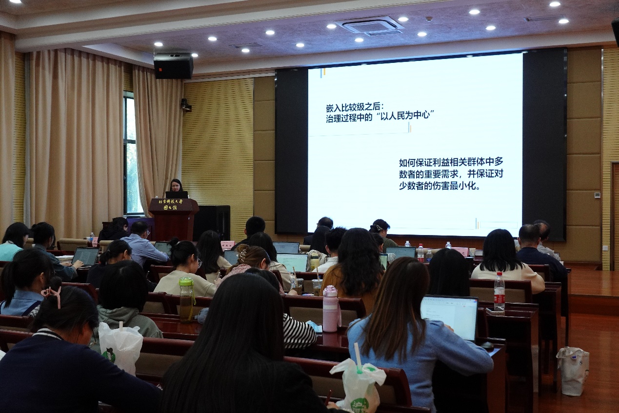 其次,何教授从城市治理的角度来阐述“以人民为中心”,具体讲述了有效治理和“人民算法”的问题。“有效治理”的基本问题,是通过特定制度安排实现人民的充分生存权和适度发展权,并保持多数人与少数人、公权与私欲、当下与未来的相对平衡。何教授认为城市治理是国家治理体系的一个很重要的部分,社区治理既是城市治理的基础,也是以人民为中心治理的基石。在治理实践中,体现“以人民为中心”的发展思想,将“以人民为本”贯穿于治理过程中,表现为“以人民为先”。以人民为先,是说出现矛盾、出现冲突、出现多种价值选择的时候,以人民为先。实现以人民为先,需要专业性,也需要科学性。而“人民算法”就是为具体治理过程的决策选择提供科学的模型。在分析了“人民至上”理论和“人民分层”方法的基础上,何教授就“人民算法”做了深入浅出的说明。“人民算法”的核心是需求的测算,即了解人民需要什么,需求如何实现,冲突性需求如何达到平衡。让多数的、重要的、迫切的人民及其需求变成可发现、可感知、可预判的具体政策对象,找到众人之痛,寻求制度化解决。